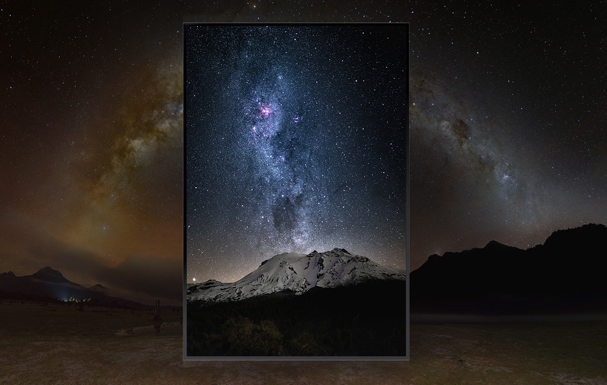 Fotografia con técnica de astrofotografía con imagen del Volcán Calbuco y la hermosa via láctea emergiendo de este.